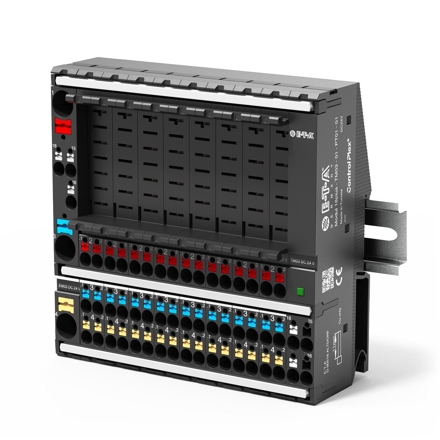The new power distribution system Module 18plus is a compact wiring solution for all load and signal lines of the DC 24 V control voltage - no matter whether it is for decentralised power distributions or for centralised plant concepts. The system accommodates various E-T-A circuit breakers and overcurrent protectors and holds a complete mounting and power distribution system with state-of-the-art push-in technology for DIN rail mounting.