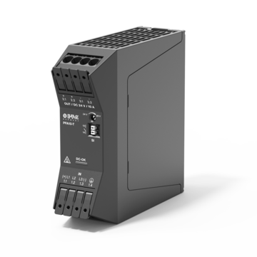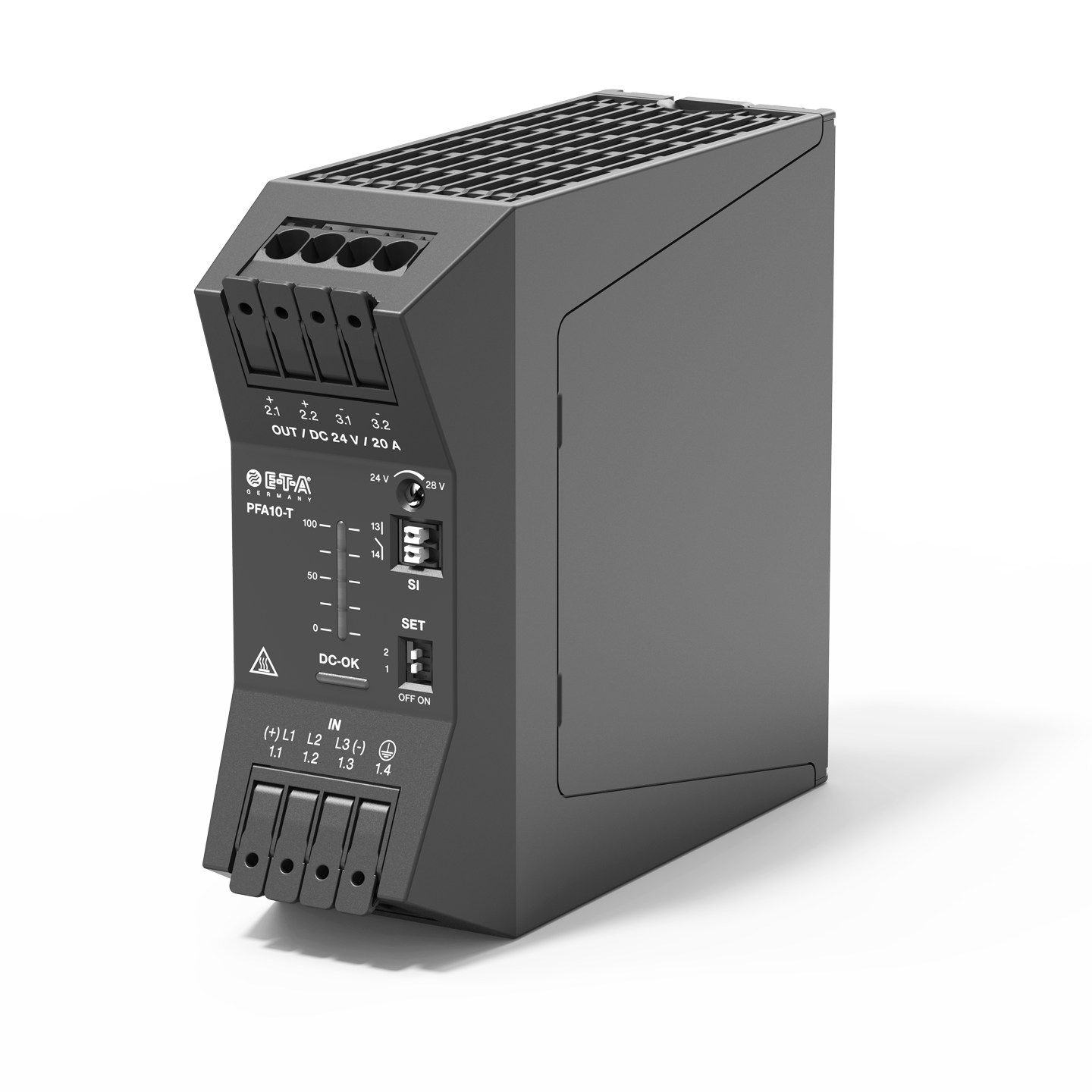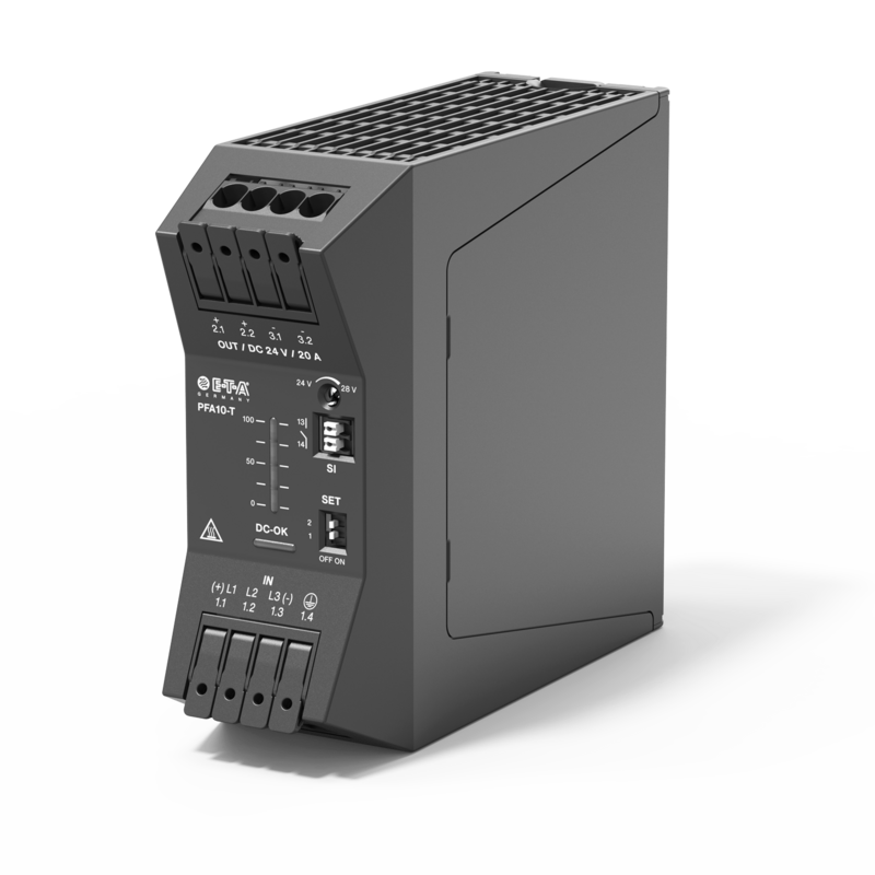 PFA10-T一次パルス方式スイッチング電源ユニットは、自動化および機械工学アプリケーションに最適です。コンパクトな設計により、設置スペースの限られた制御盤にも省スペースで組み込むことができます。25°に傾斜した接続端子を備えた筐体により、工具を使わない設置や迅速な交換が可能です。三相AC入力は、DC電圧での運用にも対応しています。DC24V出力、最大95.3%の効率、480Wの出力電力、および最大7.5秒間の150%過負荷許容により、本電源ユニットは変化の激しい産業アプリケーションのあらゆる要件を満たします。